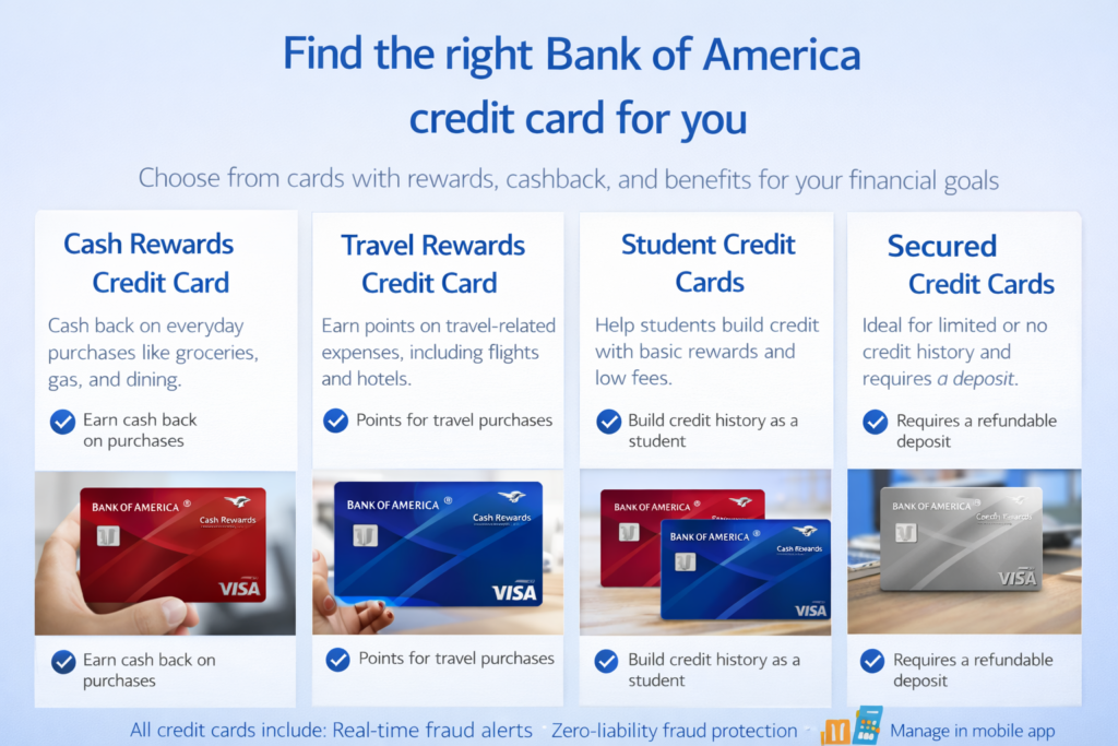 Bank of America has a variety of credit cards. Each is designed to meet different spending habits and financial goals. These cards offer rewards, cashback, and benefits. They also include fraud protection to keep your transactions secure.